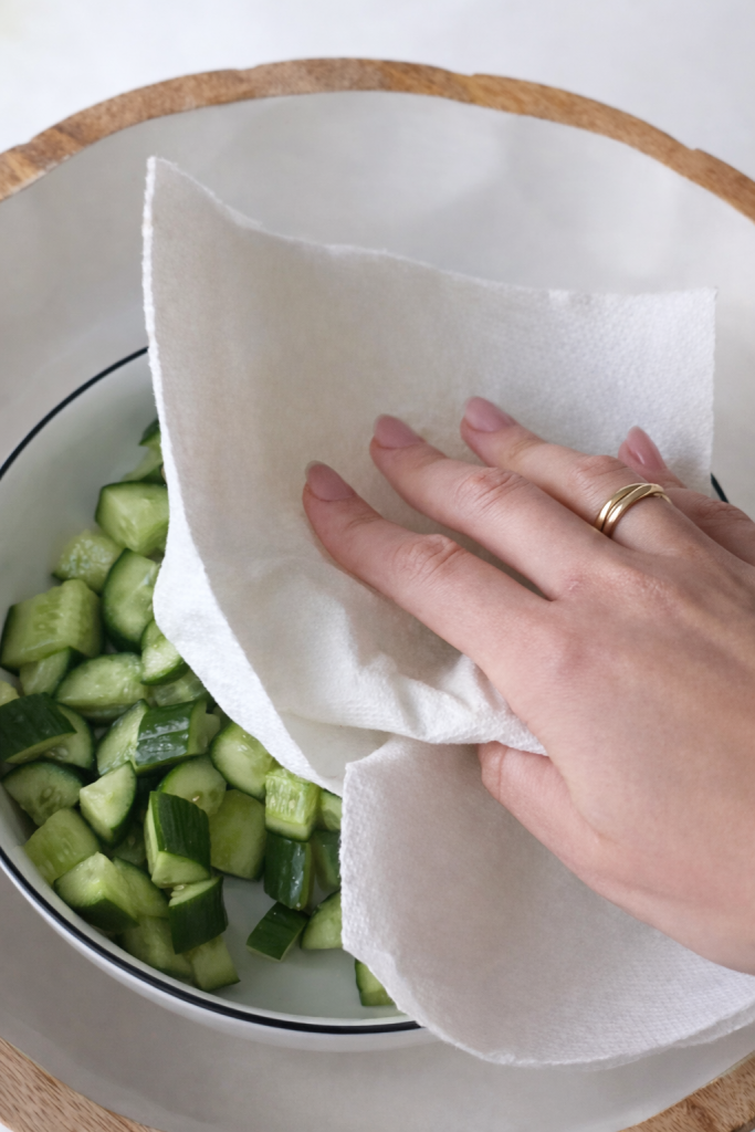 Lightly salt the cucumbers and let them sit for 5–10 minutes, then drain the released liquid.