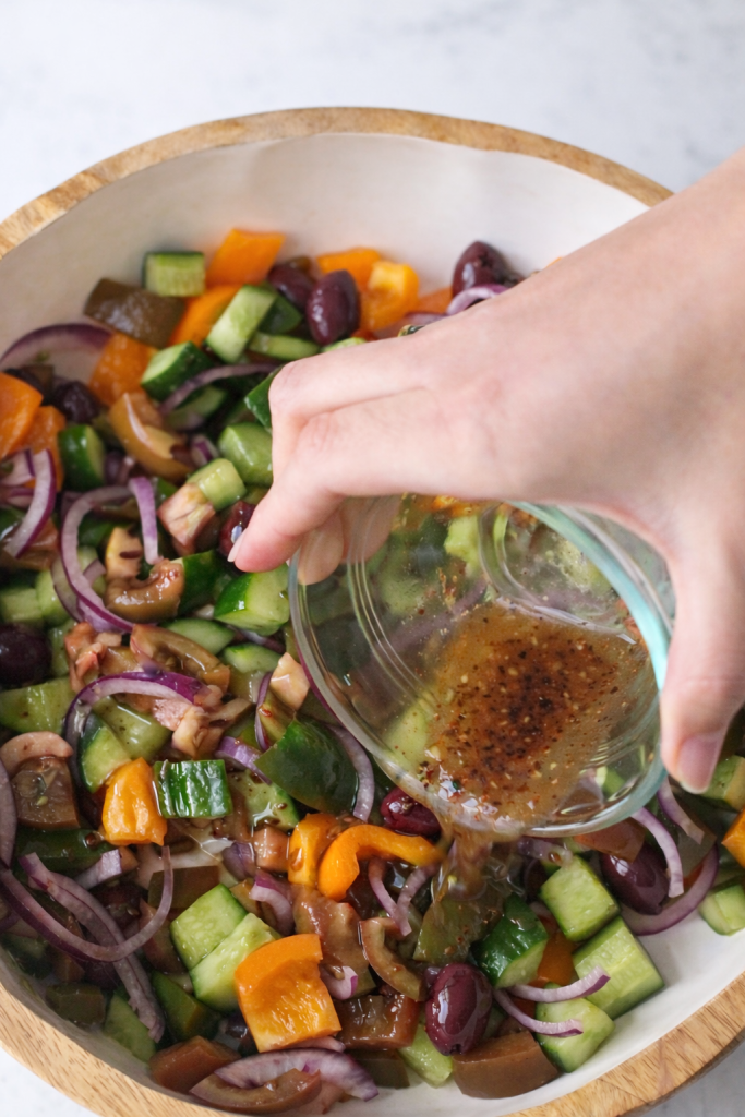 - In a large bowl, combine tomatoes, cucumbers, onion, bell pepper, and olives. Pour the dressing over the vegetables and gently toss.