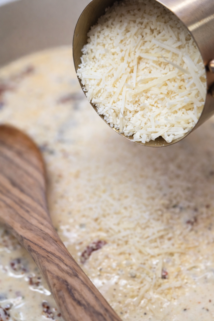 Made with cream, Parmesan, and sun-dried tomatoes, it’s the perfect foundation for multiple variations — from sausage to mushrooms and burrata cheese: