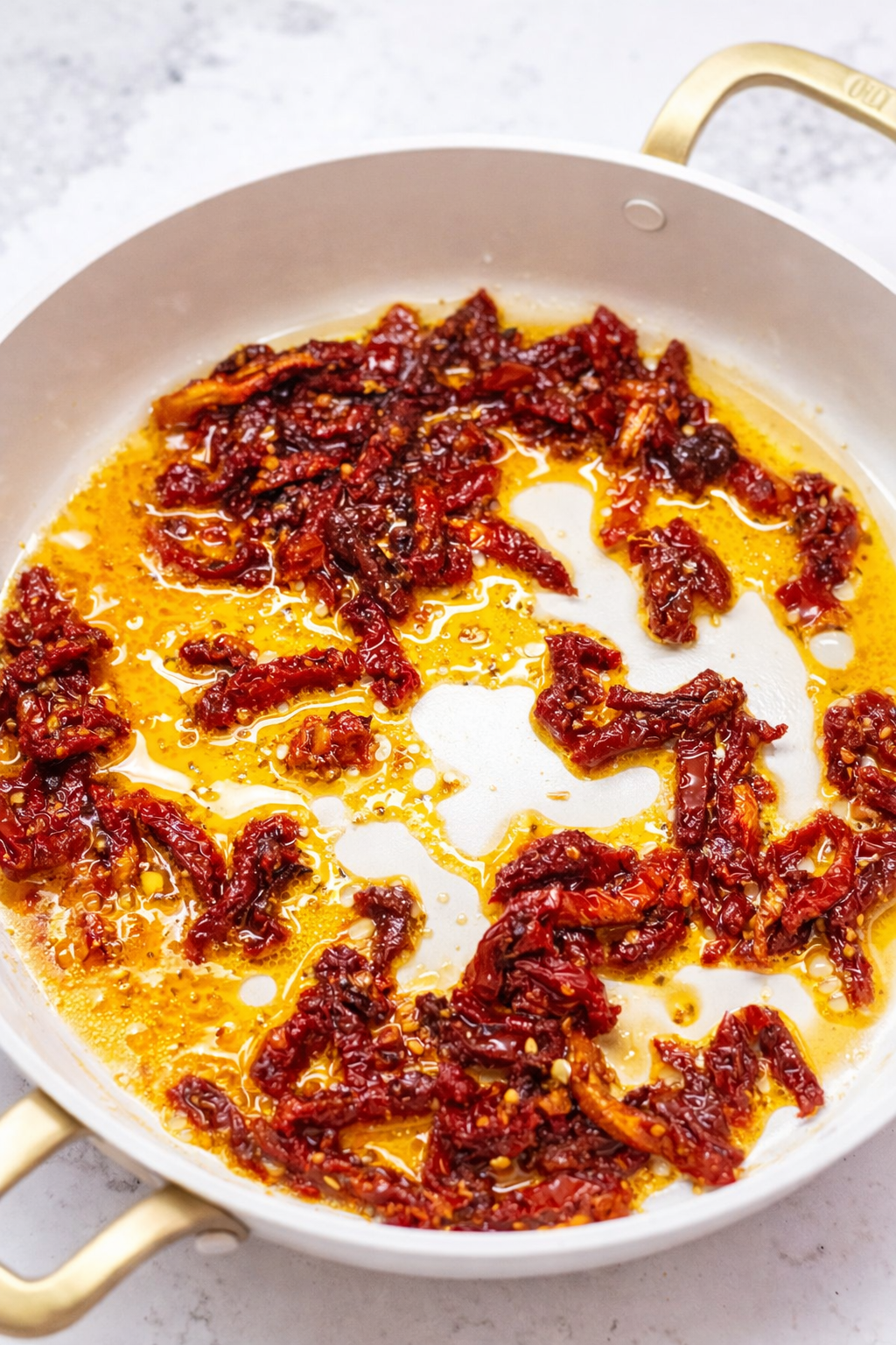 - Add sun-dried tomato oil and sliced sun-dried tomatoes.