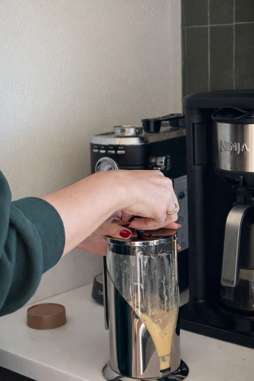- Pump the French press 10–20 times to create foam.